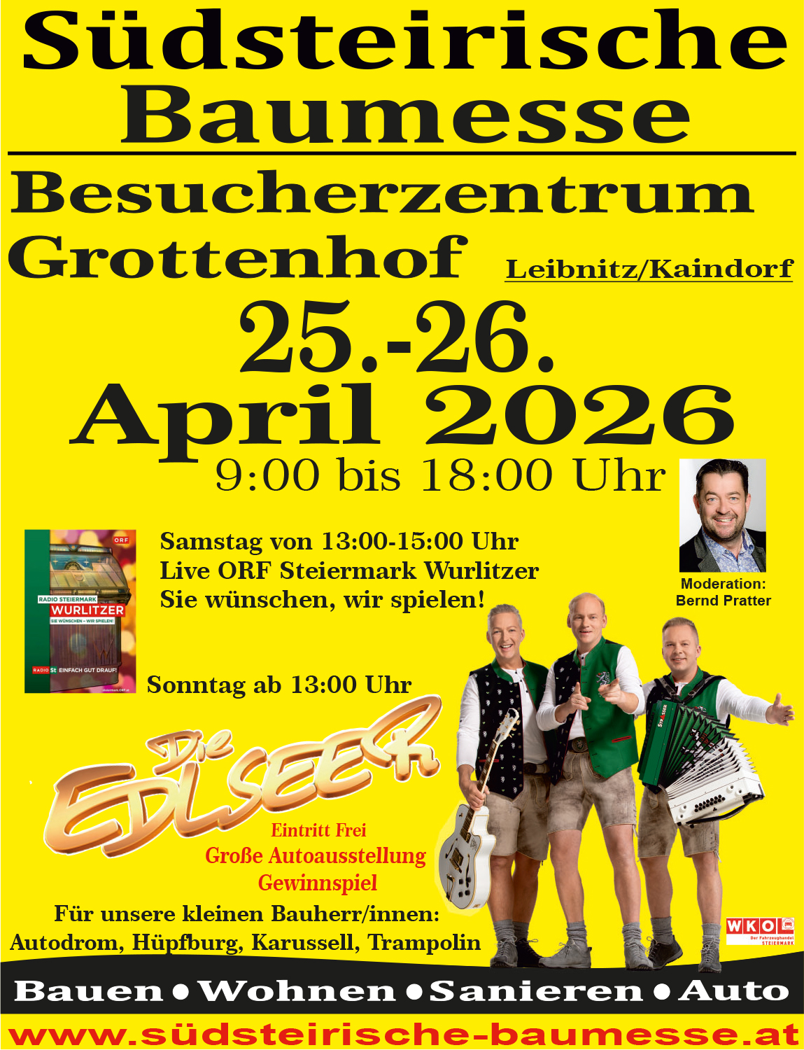 Vor zehn Jahren im Kleinen begonnen, wuchs sich die Südsteirische Baumesse zur regionalen Leistungsschau des Baugewerbes aus. Am Samstag, 25., und Sonntag, 26. April, werden die Besucher des Grottenhofs von rund 100 Ausstellern erwartet.