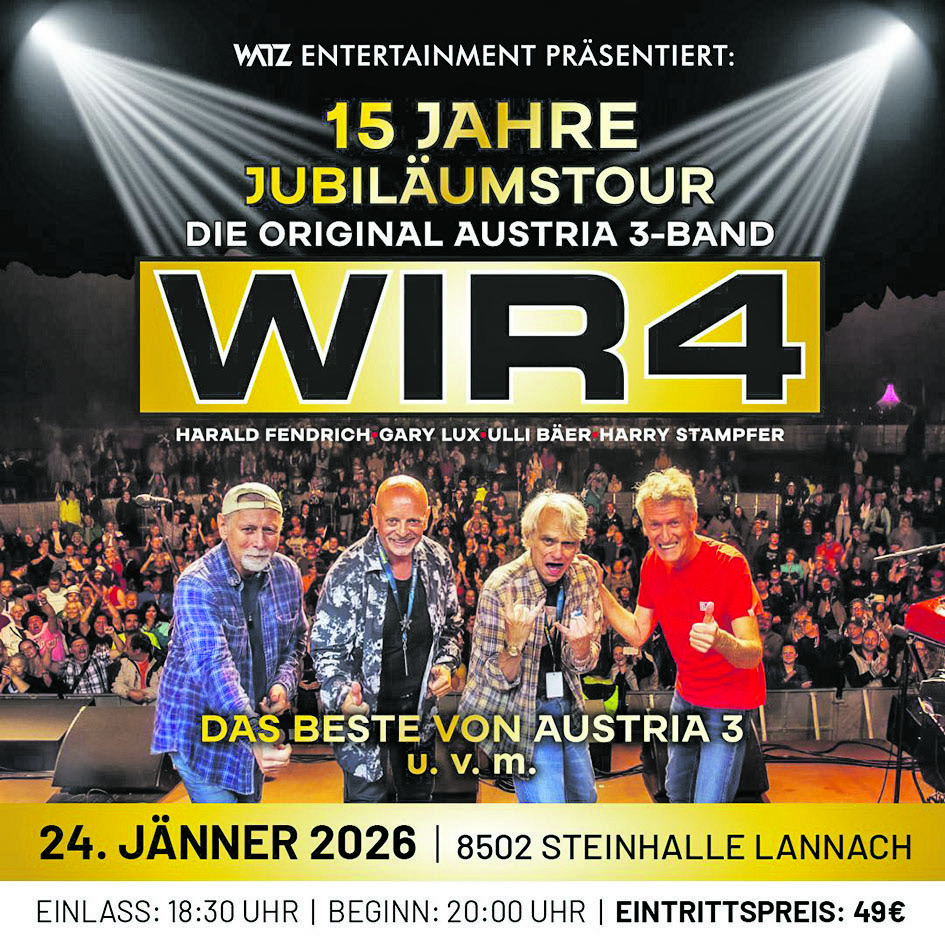 Am Samstag, 24. Jänner, holt WATZ-Entertainment WIR4 in die Steinhalle Lannach. Die Aktiv Zeitung verlost 5 x 2 Tickets unter ihren Lesern.